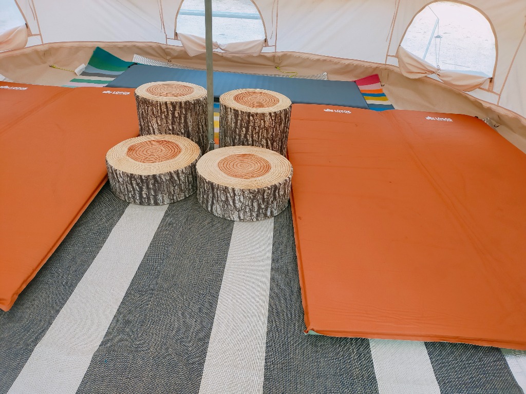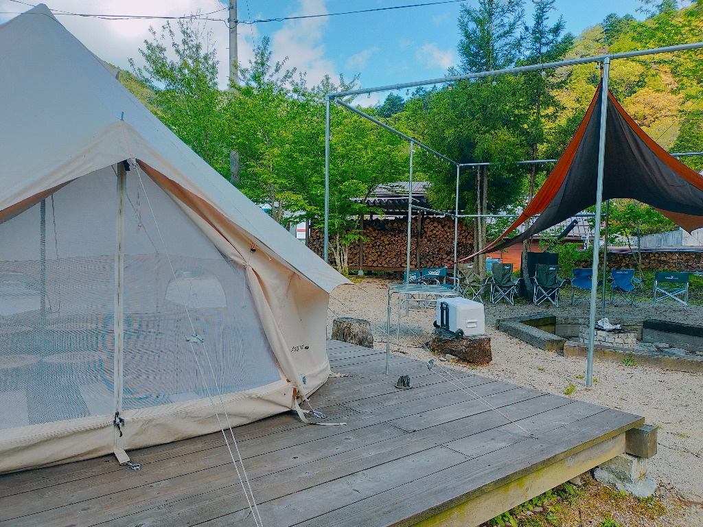 テントやタープなどの持込は自由です。スペースとしては、レンタルテント以外に大型のテントが二張は余裕があります。小型のものであれば他に3張りぐらいは張れそうです。