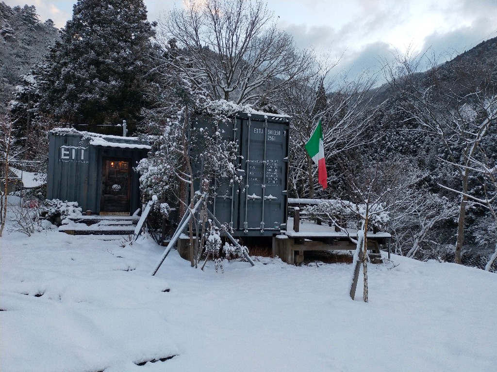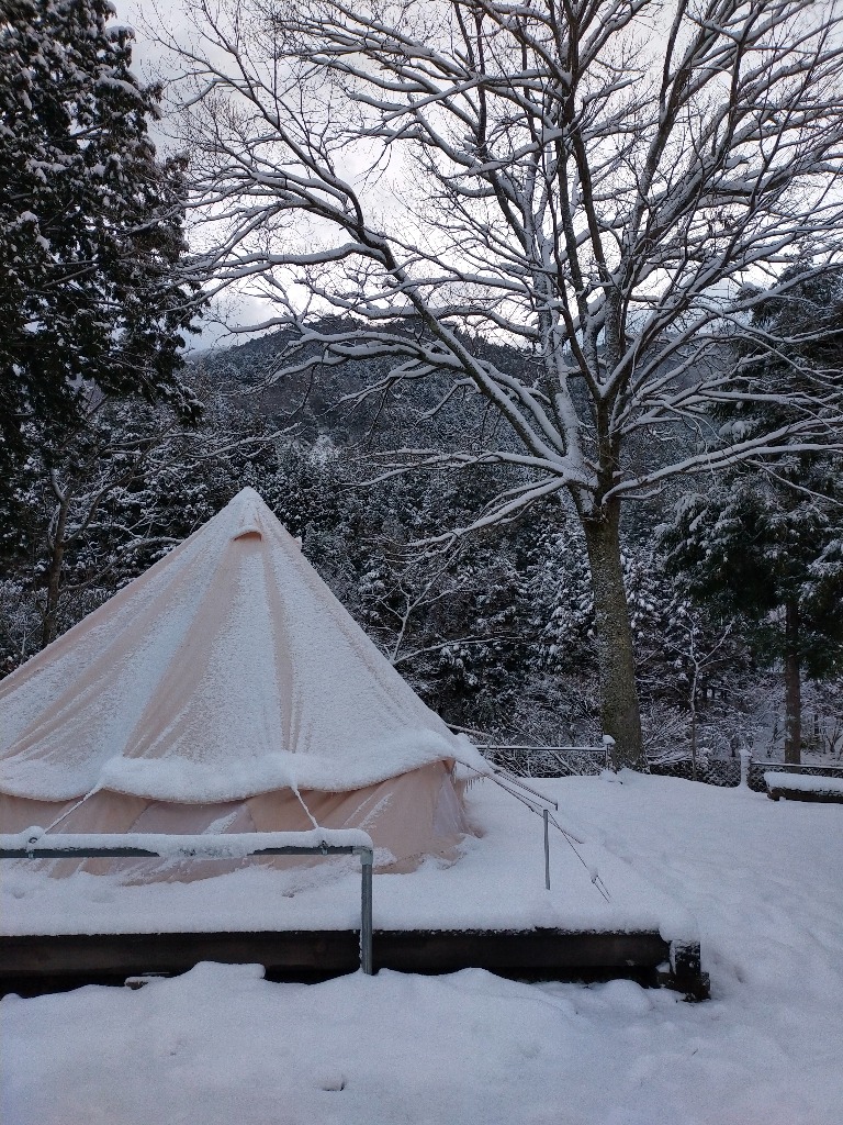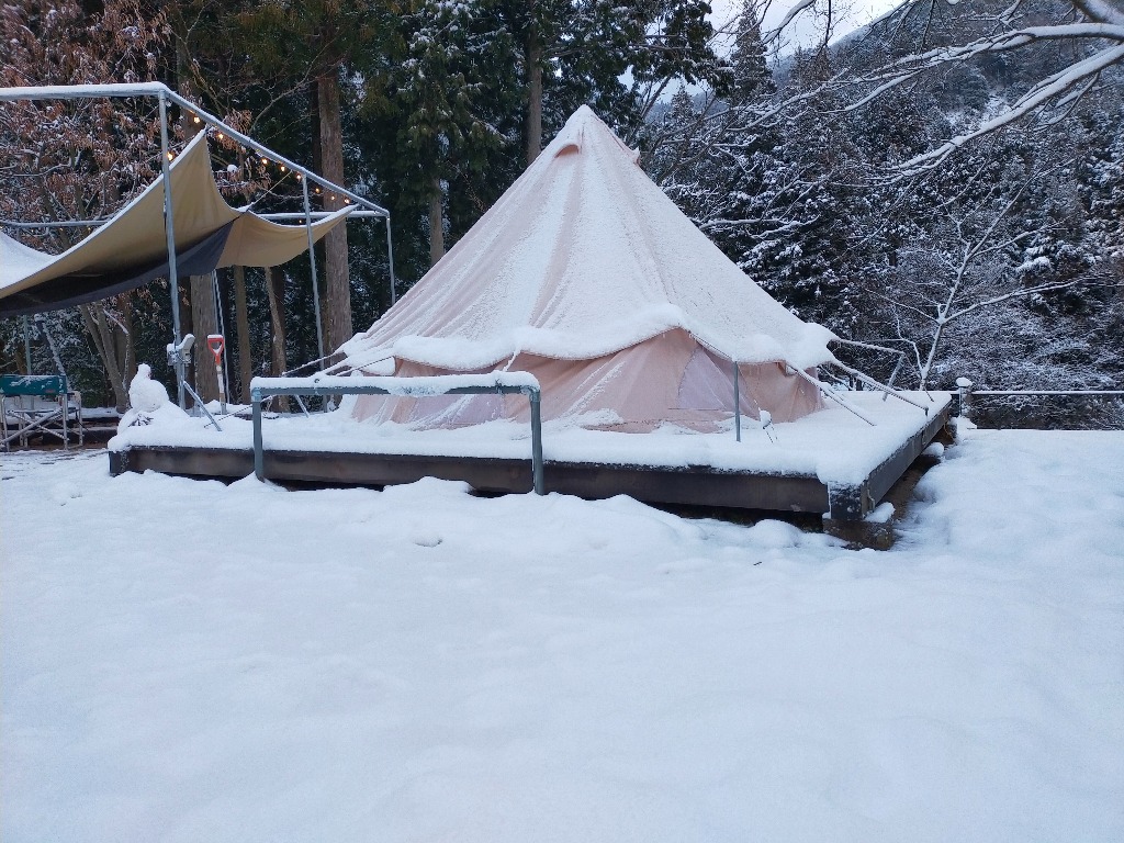 3月9日は朝から雪がちらつきました。天気予報では早朝のみで後は曇予報でしたので、少し甘く見ていました。大阪から来られるお客様には3日前に連絡して、日程をもう1週間後にしてはと提案させて頂きましたが、都合が合わずこの日に決行することになりました。滋賀県東近江市の山間部にあるpizzeria魚幸商店キャンプ場は東近江市内の予想気温よりマイナス3は想定しなければなりません。雪が降らないにしても氷点下での夜を過ごすので、電気カーペットや電気ストーブを持ってきてもらうことにしました。当日の朝は雪が散らつく程度でしたが、雪はいつまで経っても降り止まず天気予報も雪マークが一日に変わっていきました。いくらなんでも大阪からにこの環境は厳しいかと当日の朝9時を待って電話を入れました。もちろん中止の提案でしたが、すでにこちらに向かわれていましたので、慌ててキャンプ場の雪かきをして、アスガルドのテントと大型のタープを準備しました。一晩中降り続いた雪はテントを白く覆いかまくらみたいでした。かなり心配しましたが、アスガルドのテントは電気カーペットと電気ストーブで快適だったようです。しかし、翌朝タープにはびっしり積雪で重さに絶えられなく無惨な状況になってしまいました。もっと角度をつけて雪が下に落ちるようにしておくべきでした。これは管理人の反省です。