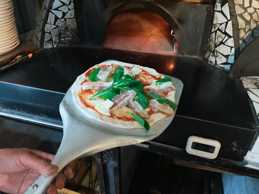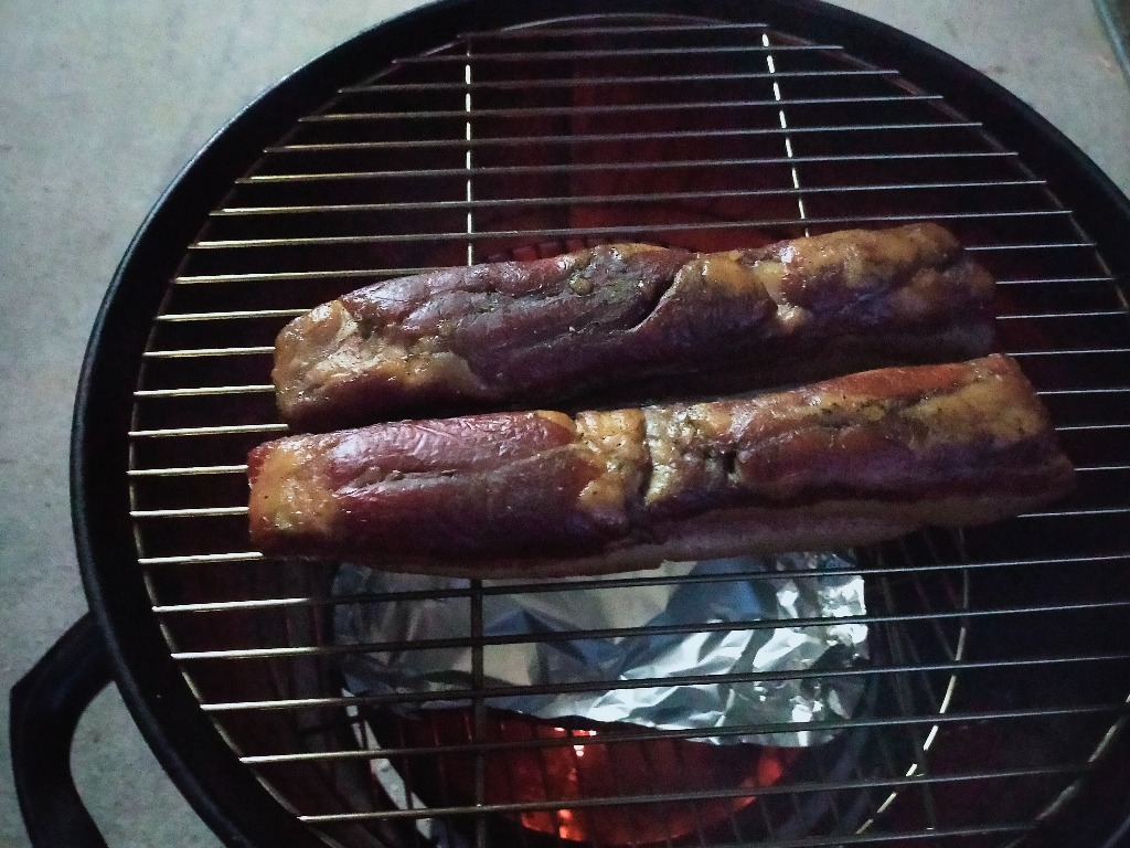 pizzeria魚幸商店は薪窯ピッツアとキャンプを運営しています。キャンプは初心者も対応できるように「手ぶらでキャンプ」をメインテーマに、できるだけ荷物を少なくして、お楽しみの時間が沢山確保できるように考えています。また、隣には薪窯ピッツアの店をやっていますので、BBQのときに何枚かをシェアしてもらうこともできます。今回はお勧めの自家製ベーコンを使ったピッツアの紹介てす。今の時季によく注文されるメニューは「自家製ベーコンと永源寺舞茸のトマトソースピッツア」「自家製ベーコンとベビーリーフのビアンカピッツア」です。何より自家製ベーコンのハーブの香りが食欲をそそります。この自家製ベーコンは三重県いなべ市にあるさくらポークを使っています。豚バラ肉を1kgのブロックで購入し、海塩と数種類のハーブで2週間漬け込みます。もちろん低温熟成させるので、大きな冷蔵庫を使います。毎日漬け込んだハーブが上手く馴染むように裏返したりすり込んだりの繰り返しです。漬け込みは1週間も1ヶ月も試しましたが、1週間では、味に深みがなくもう少し長期に