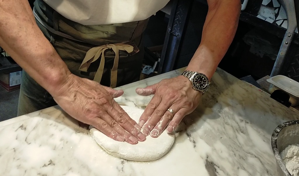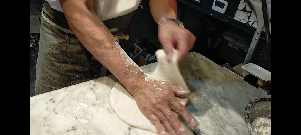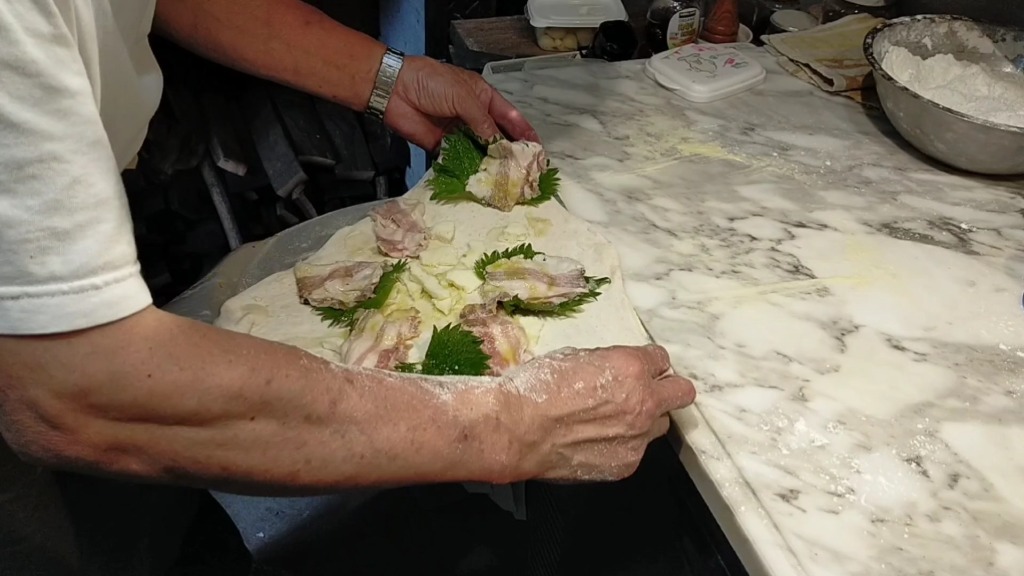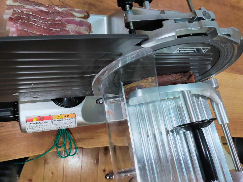漬け込みする必要があると感じました。流石に1ヶ月は不安なので3週間を試しましたが、2週間漬け込んだものとあまり大差を感じませんでしたので、安定的に提供するために2週間の漬け込みにしています。漬け込んだブロックを湧き水で塩抜きをして、一晩乾燥をさせます。その後は一日かけて桜のチップで燻製しています。もちろん温度管理が重要になるので、一日目が離せません。このように手間を掛けてスライサーでカットしていきます。出た切れ端は家の料理で登場します。ペペロンチーノは定番になりました。ハーブの香りと海塩の甘みで一押しですが、お店のめには並びません。