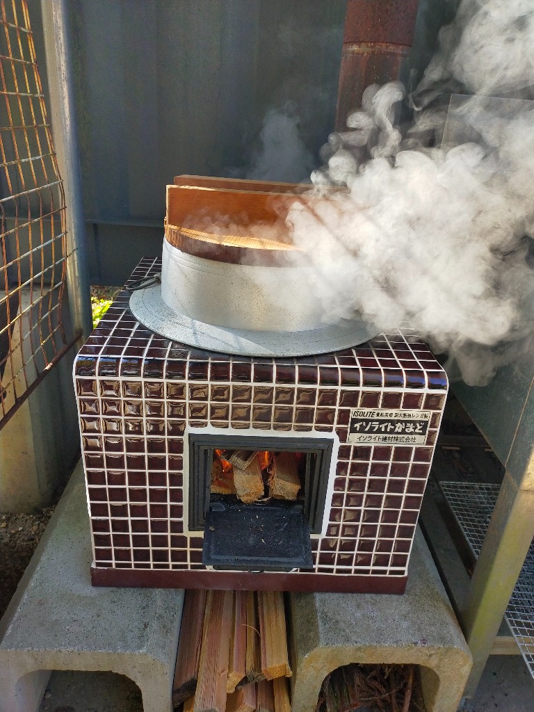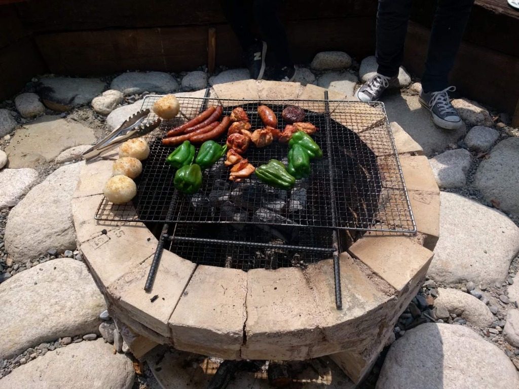 スギやヒノキの太割の薪を用意しておきますので、キャンパーのみなさんでナタを使って小割にしてもらいます。スギの葉で火入れをして、小割にした薪を少しずつ様子を見ながらくべていきます。炎が強くなる頃には、かまどの羽釜からぐつぐつとお米の炊きあがる音と共に何とも言えないお米の良いにおいが充満してきます。湯気のピークが近づくのをあなた自身の五感で感じ取ってください。その時が来たら、かまどの熾火を全てかき出して、15分蓋を取らずに蒸らせば出来上がりです。炭火で焼いたお肉と合わせて炊き立てのご飯をお召し上がりください。